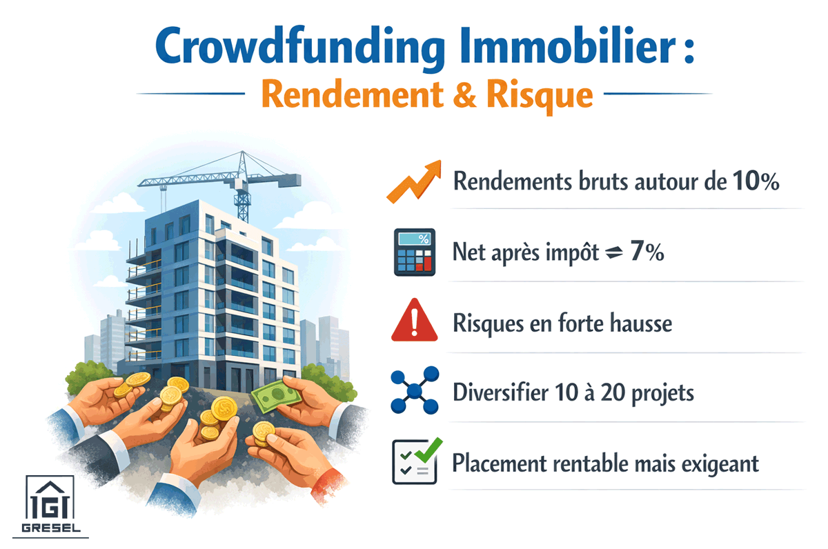 Toutefois, ces rendements bruts doivent être analysés après fiscalité. Les intérêts perçus sont soumis au prélèvement forfaitaire unique (PFU) de 30%, aussi appelé flat tax (12,8% d’impôt sur le revenu + 17,2% de prélèvements sociaux). Un rendement brut de 10,9% se traduit donc par un rendement net d’environ 7,6%. Il reste possible d’opter pour le barème progressif de l’IR si cela s’avère plus avantageux. À noter : le crowdfunding immobilier n’entre pas dans l’assiette de l’IFI, un avantage fiscal non négligeable.
